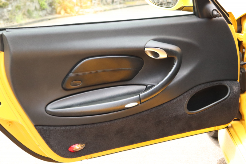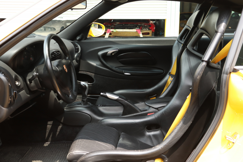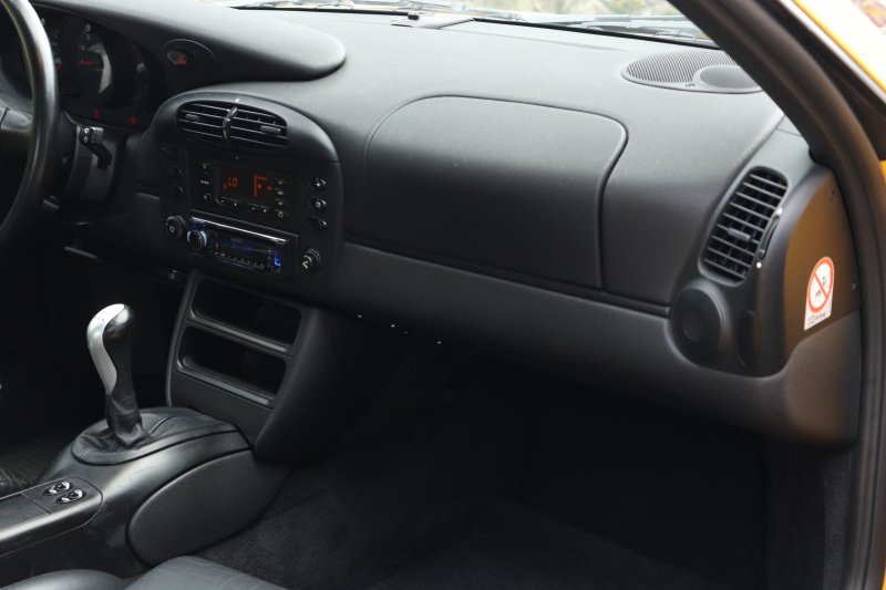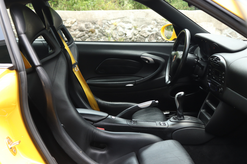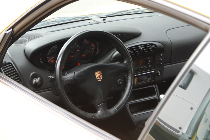 スピードイエローの鮮やかなボディが印象的な1999年式911 GT3(Type 996・前期型)。走りの歓びを感じさせる一台です。走行距離13.7万kmながら、エンジンはセル一発で始動しアイドリングも安定。機関系は良好で、アクセルを踏み込むたびに自然で心地よい吹け上がりが広がります。社外マフラーから響くサウンドがドライバーの高揚感をいっそう引き立てます。
