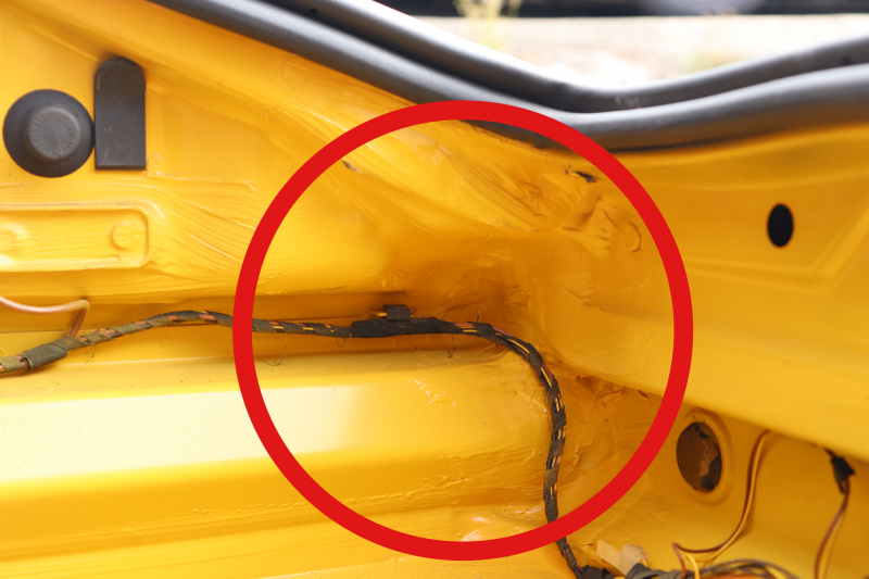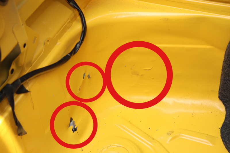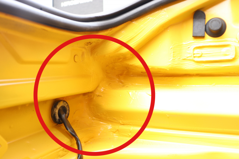 修復歴については、フロント左右とリアに修復歴があります。フロントフロア全体塗装とクリアの再施工、衝撃による塗装割れやシーリング部分の違和感。リアは右側の裏面に溶接したとみられる痕が確認されます。お客様は左フロントのみの修復歴と聞いて購入されていますが、当社基準ではフロント左右およびリアに修復歴があると判断し、修復歴有としています。