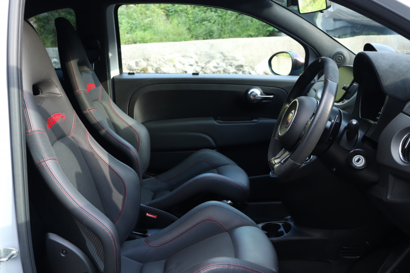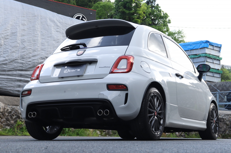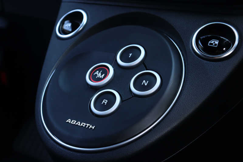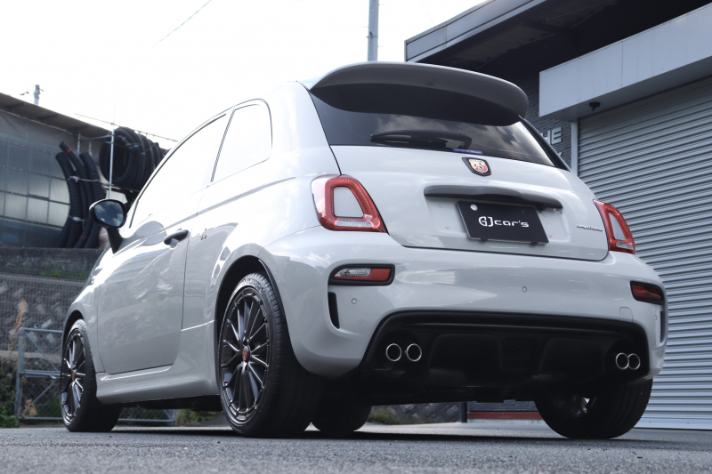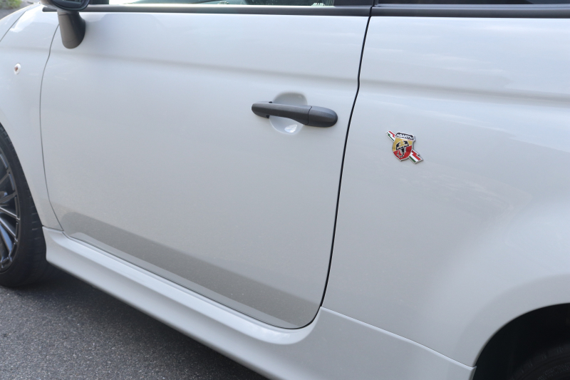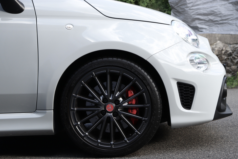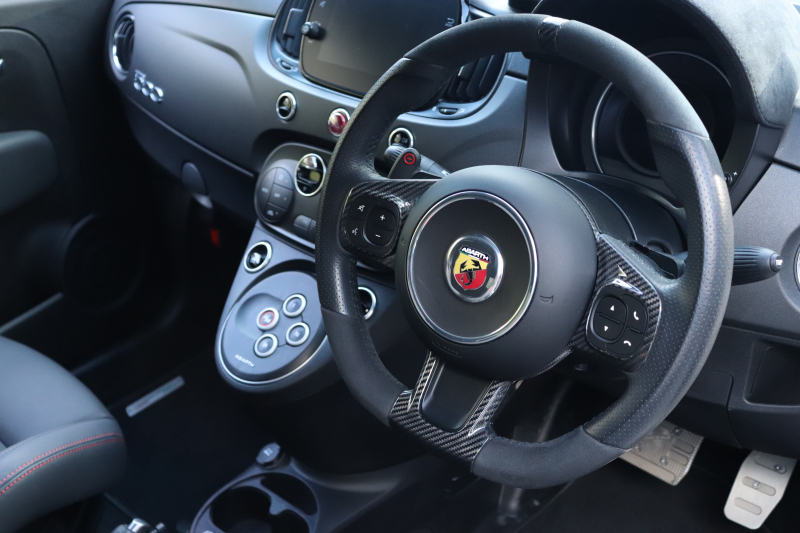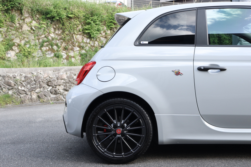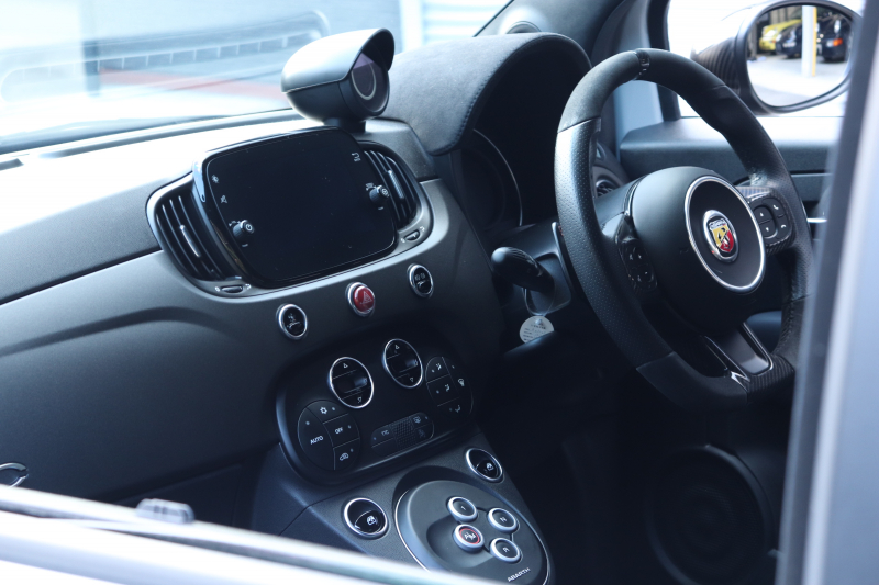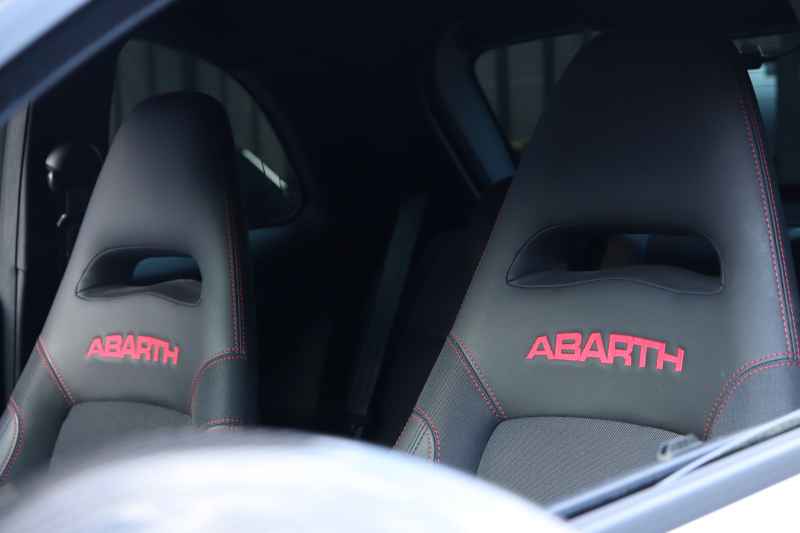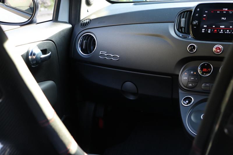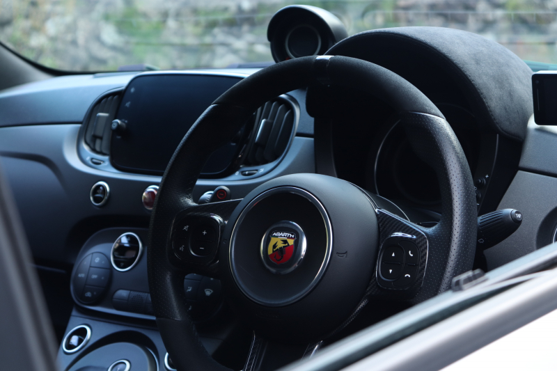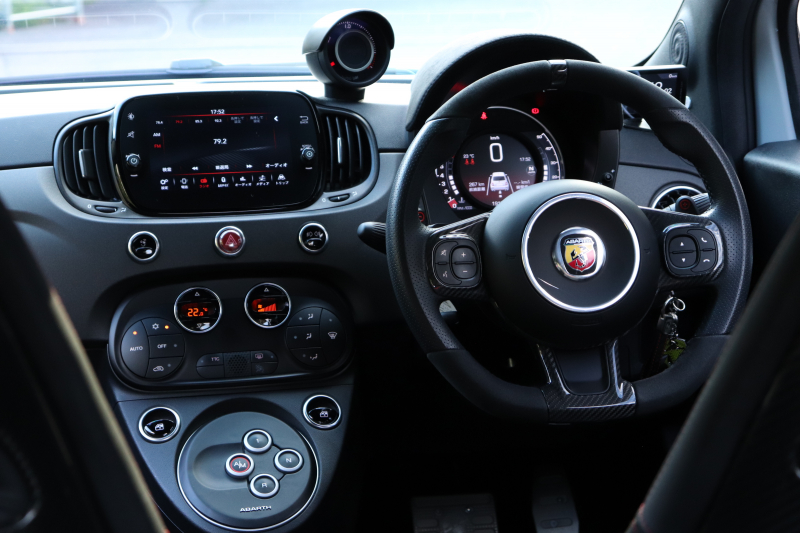 ボディカラーのグリジオ・カンポヴォーロは、アバルトらしい硬派な雰囲気を静かにまとわせています。ブラックの内装とも相まって、視覚的にも引き締まった印象を与えています。