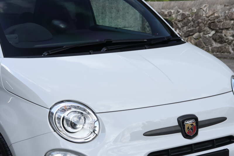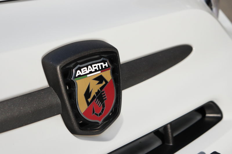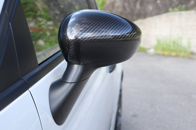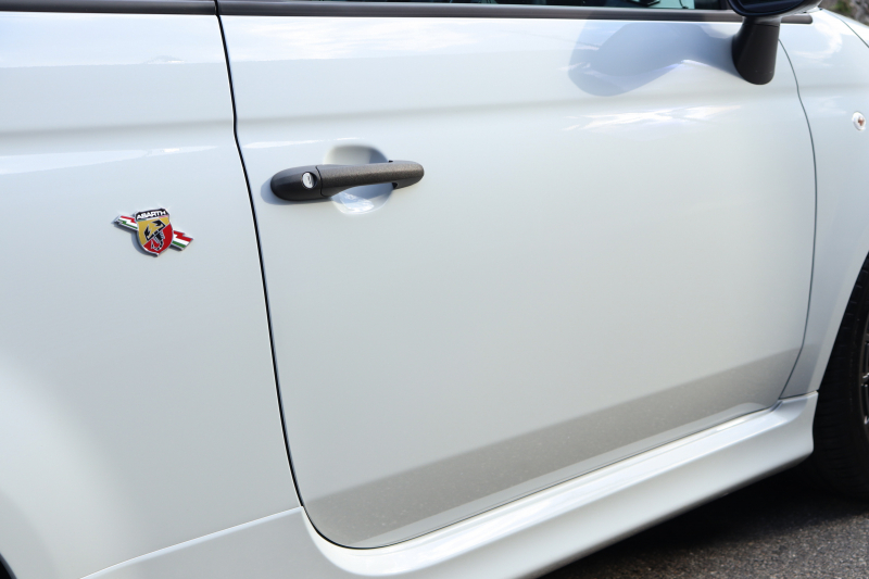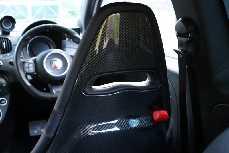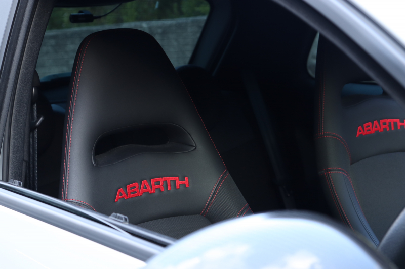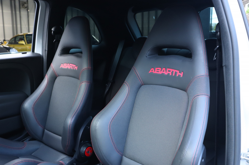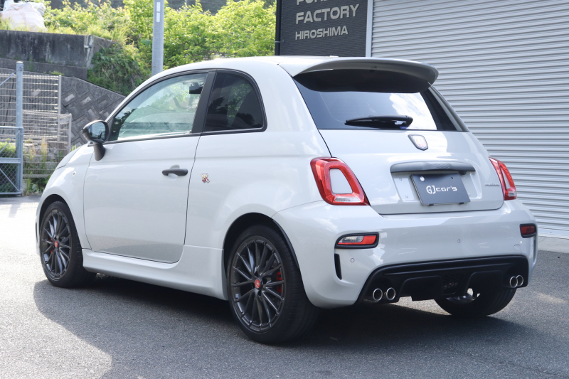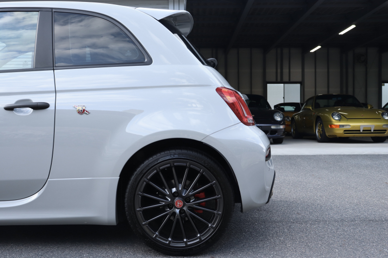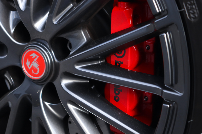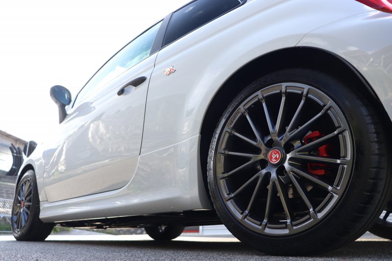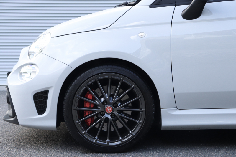 ボディカラーのグリジオ・カンポヴォーロは、アバルトらしい硬派な雰囲気を静かにまとわせています。ブラックの内装とも相まって、視覚的にも引き締まった印象を与えています。