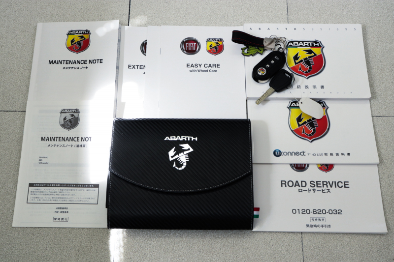 記録簿は3枚、すべてアバルト正規ディーラーでの整備履歴が残っており、走行性能を維持するためにしっかりとメンテナンスが行われています。きちんと走るために必要なケアが施されていることが伝わります。取扱説明書やスペアキー、保証書も揃っており、管理状態も良好です。