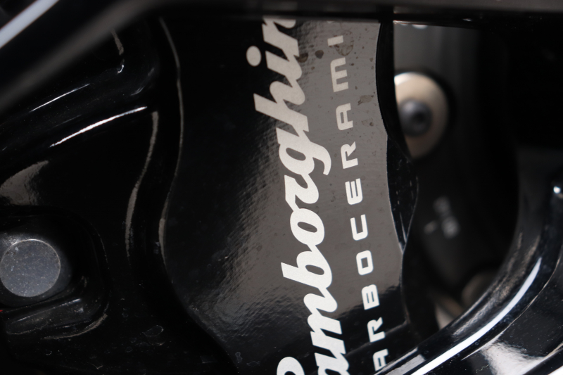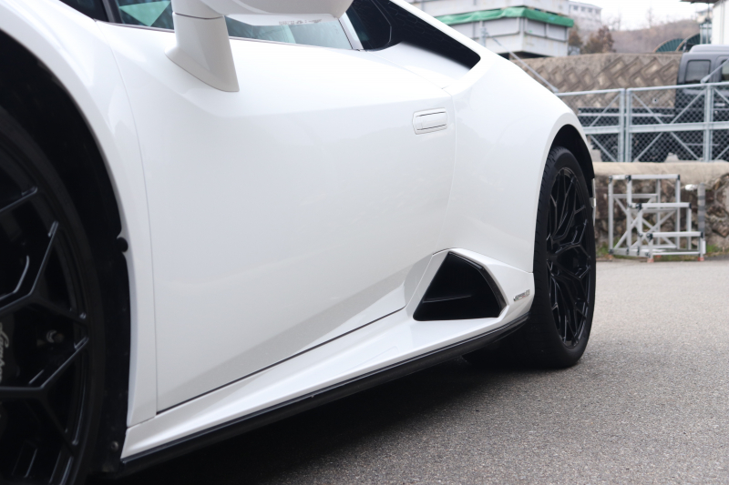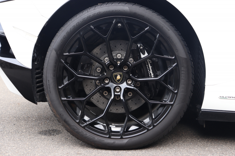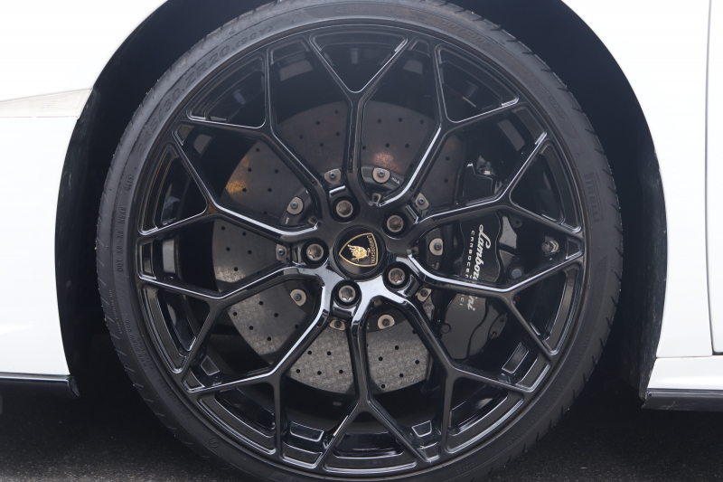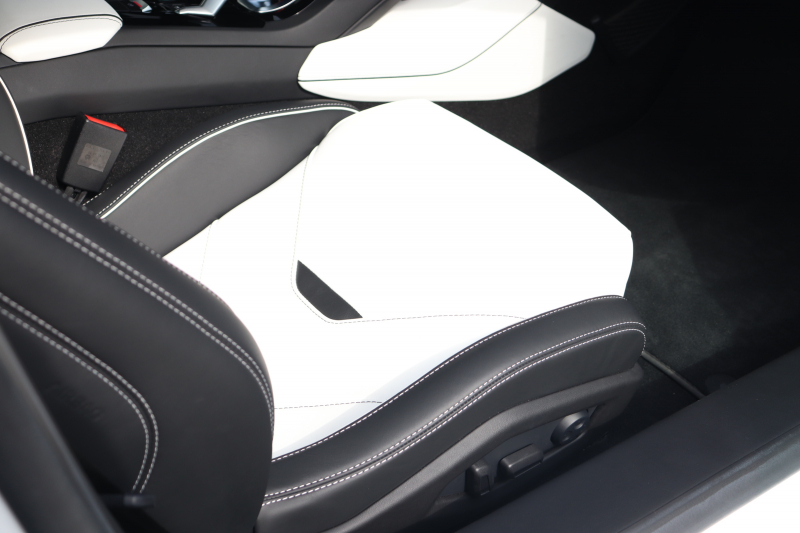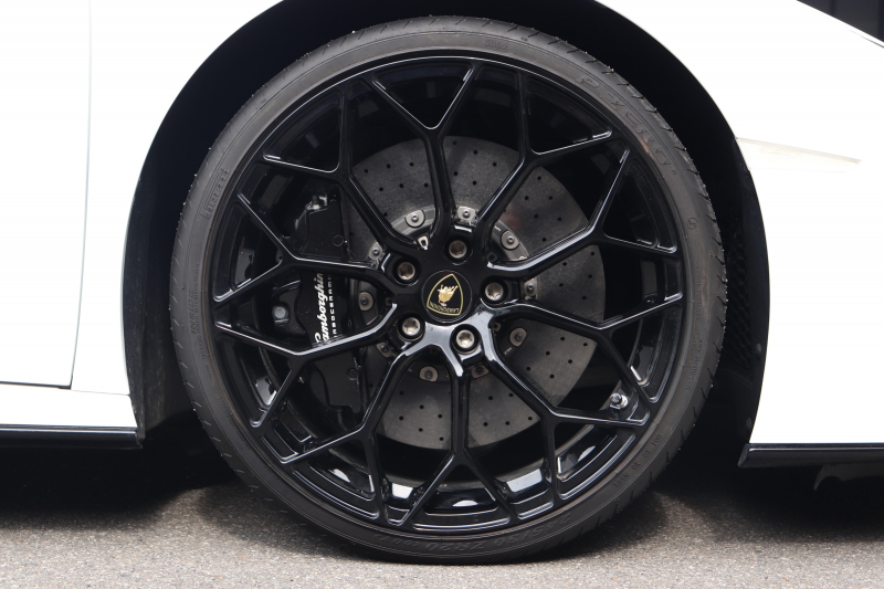 外装はビアンコモノセルス。純白のボディがウラカン特有の鋭いプレスラインを明確に浮かび上がらせます。そこにフロントスポイラー、サイドスカート、サイドダクト、リアバンパー、リアスポイラー下部のグロスブラックを組み合わせることで、輪郭が強調された立体的な印象を形成。20インチ艶ありブラックホイールとブラックキャリパーが足元を引き締め、ボディとのコントラストを完成させています。